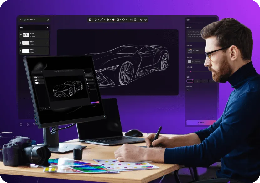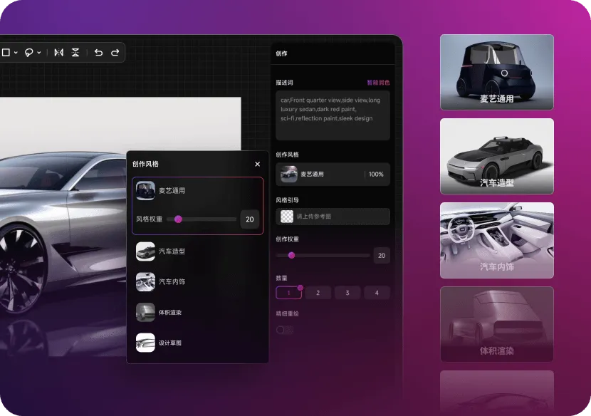 基于4000 万+ 高质量汽车真实照片,。深度理解设计精髓,出图细节丰富逼真。传统画笔工具与云端无缝结合,激发无限灵感