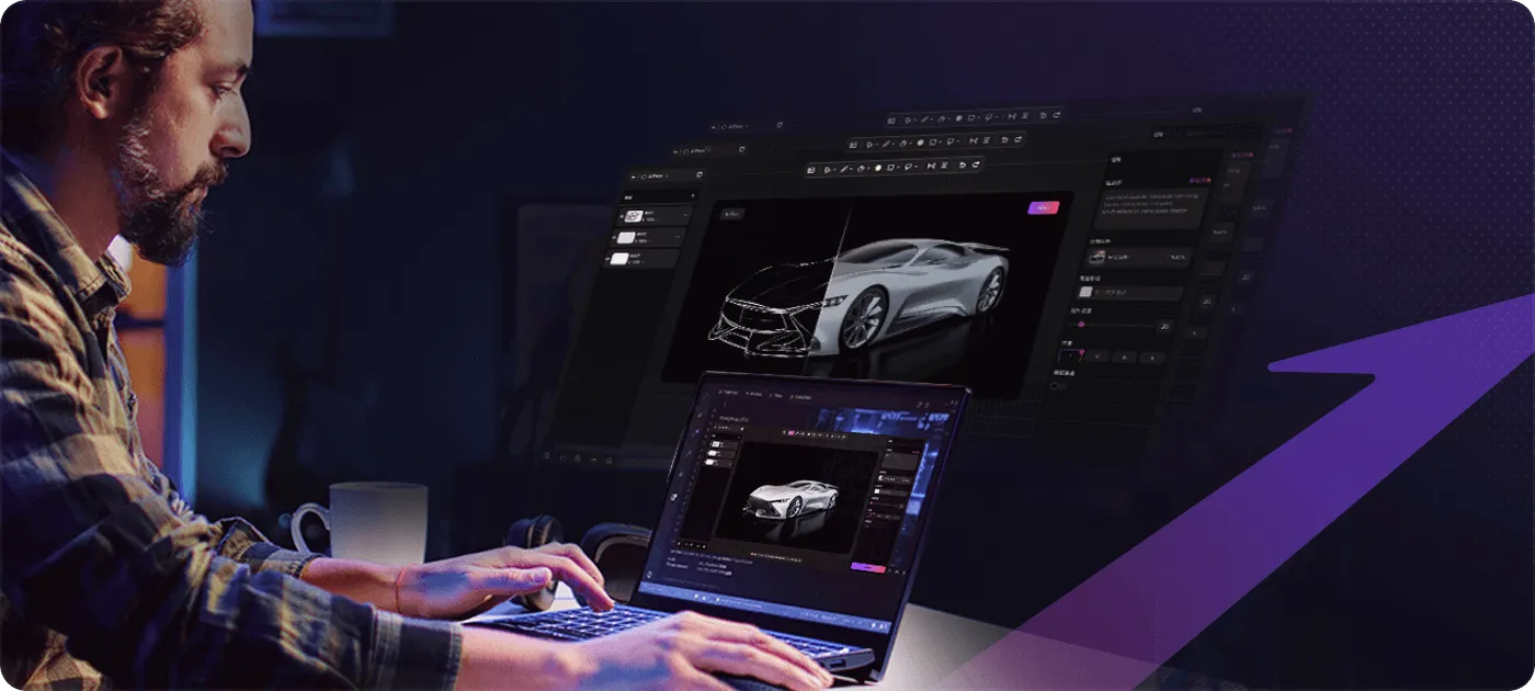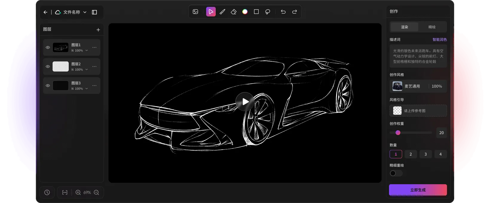 基于4000 万+ 高质量汽车真实照片,。深度理解设计精髓,出图细节丰富逼真。传统画笔工具与云端无缝结合,激发无限灵感